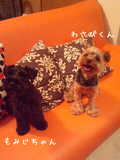ヨークシャテリアのわさびくん、ミニチュアシュナウザーのもみじちゃん。