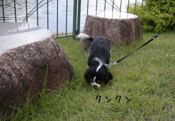 池の前でしばし匂いをかぐ福。