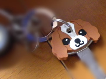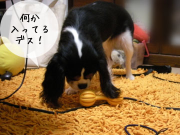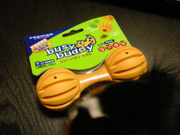 newお留守番グッズを買ってみた アイテム 2021.03.01 2008.09.01 長時間お留守番アイテムとして、こんなものを買ってみました。コングとかガジャーとかと同じで、左右の丸い部分におやつなどが詰められるようになってます。 二人ですごく迷って決めたこのアイテム。福は気に入ってくれるのでしょうか? 最初のうちは興味深く匂いを嗅いだり、そろそろと動かしていましたが、しばらくするとほったらかしに…。 フードの詰め具合が甘かったと思う。(と思いたい)お留守番の時はもっとちゃんとつめるから、ぜひ遊んで下さい。 おまけにもう一つ、人間用に購入しちゃった。キャバリアのキーカバー。結構派手だね。