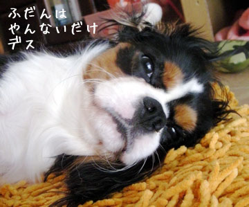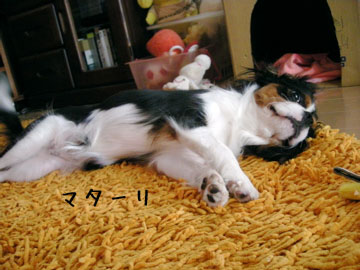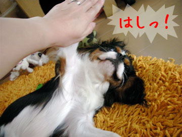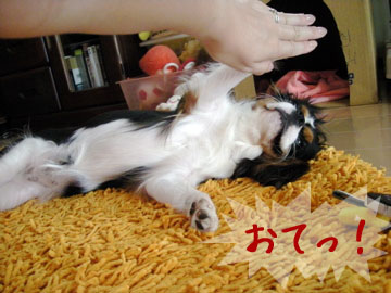 ハイグレード・お手? 成長 2021.03.01 2008.09.10 今日は久しぶりに朝、ロング散歩(1時間/近くの公園周り付き)行けました。お昼にまったり福。 一緒に寝転んで携帯触ってたら、ちょっかいをかけてきたので相手する。手を挙げると、それに合わせて犬かきをするみたいに手をくるくる回してきたので思わず 「お手っ!」と言うと、一応ピクッと反応して、この格好をした。上手に反応しております(笑)。普段、「お手」はできないのになあ。その後、プーさんの携帯についていた、革製のストラップをガジガジし、ボロボロにしたというお話(泣)。