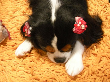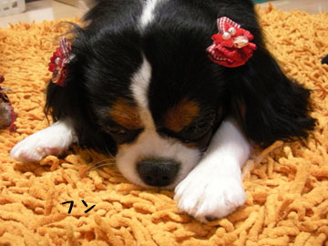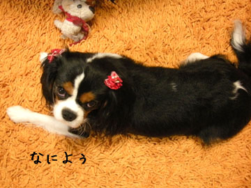 リボンをつけてもらったのにとっても人相(犬相?)が悪い。