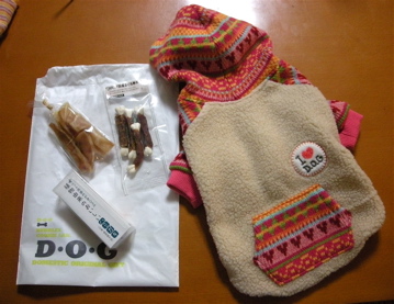 ちゃんと福のお土産を買ってきたのにな。マグロ巻きボーン、豚耳細切り、バナナ味の歯磨きジェル、上着。