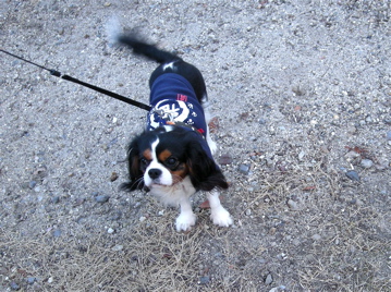 ハーネスの上に、犬鑑札を紺のゴムで背中にくくり着けたら、