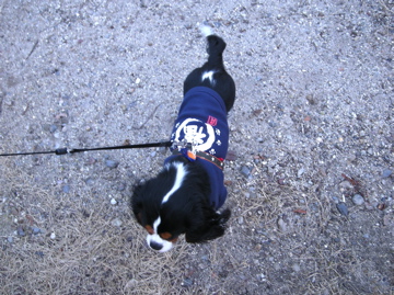 ハーネスの上に、犬鑑札を紺のゴムで背中にくくり着けたら、