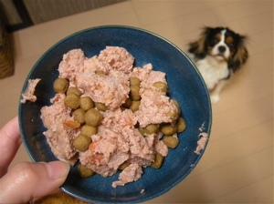 与える量が良くわからなかったので、缶の約1/4弱+ドライフードを少し混ぜました。
