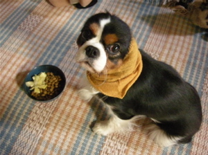 ドッグフード以外に何か入れると、福はさらに喜んでクルクル回ります。
