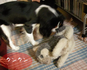 一番のお気に入りであるシベリアンハスキーのぬいぐるみのお尻のニオイをクンクンする。
