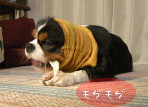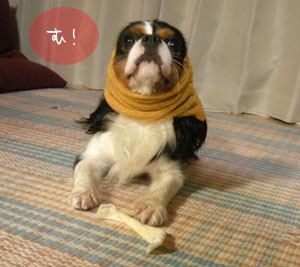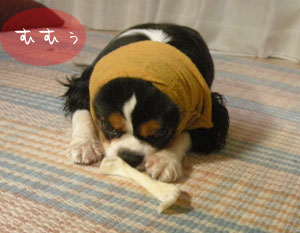 帰宅後、ごはんの時間まで、お留守番用に与えたササミ巻きガムのガムをギュッギュと噛む福。