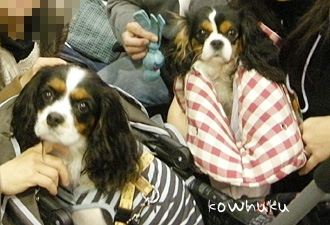 初めてキャバリアを見る人は、この2頭が同じ犬種だとは分かりにくいみたい。(^^;)