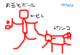ひとつは、片手にボールを載せたお玉を持ち、片手にはリードを持ち、