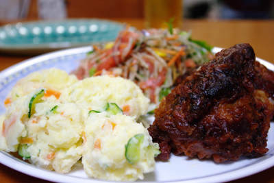 ポテトサラダ、タンドリーチキン、向こうにはスモークサーモンのサラダ。