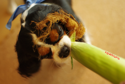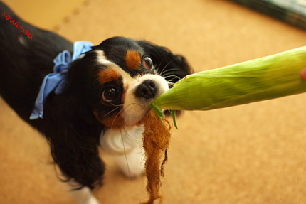 とうもろこしのヒゲを福に向けたら、かぶりついてきた(笑)