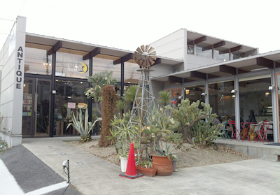 美容室と、アンティーク食器が豊富な雑貨屋さんが併設された、全面ガラスの建物。